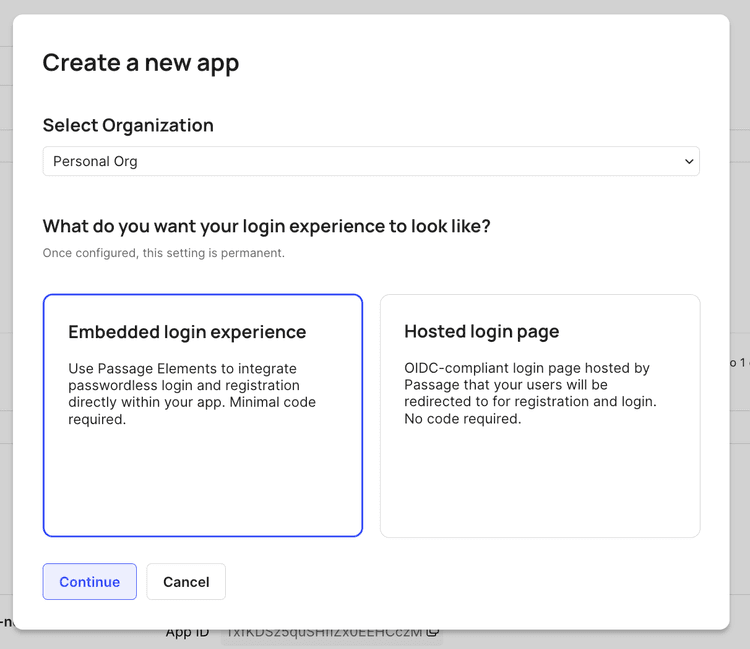 To create an app, first login or create an account for the Passage Console. When you first sign up, you will be redirected to your homepage that includes an example application to explore. To create your first new application, select the “Create New App” button on the home page and the “Embedded login experience” option.